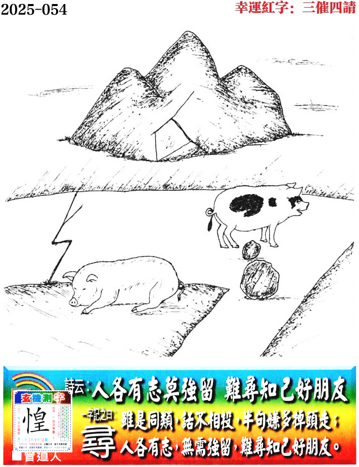 054期老版跑狗一字記之曰:【尋】 詩雲:人各有志莫強留,難尋知己好朋友。